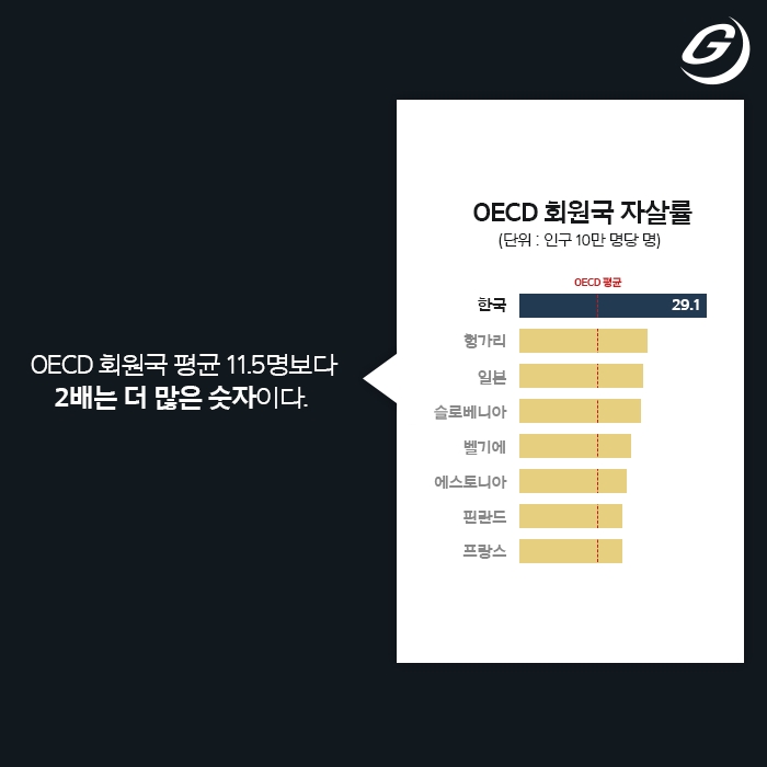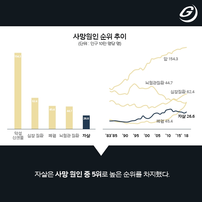 자살은 사망 원인 중 5위로 높은 순위를 차지했다. OECD 회원국 평균 11.5명보다 2배는 더 많은 숫자이다.