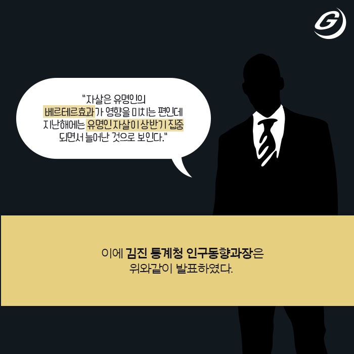 "자살은 유명인의 베르테르효과가 영향을 미치는 편인데 지난해에는 유명인 자살이 상반기 집중 되면서 늘어난 것으로 보인다."