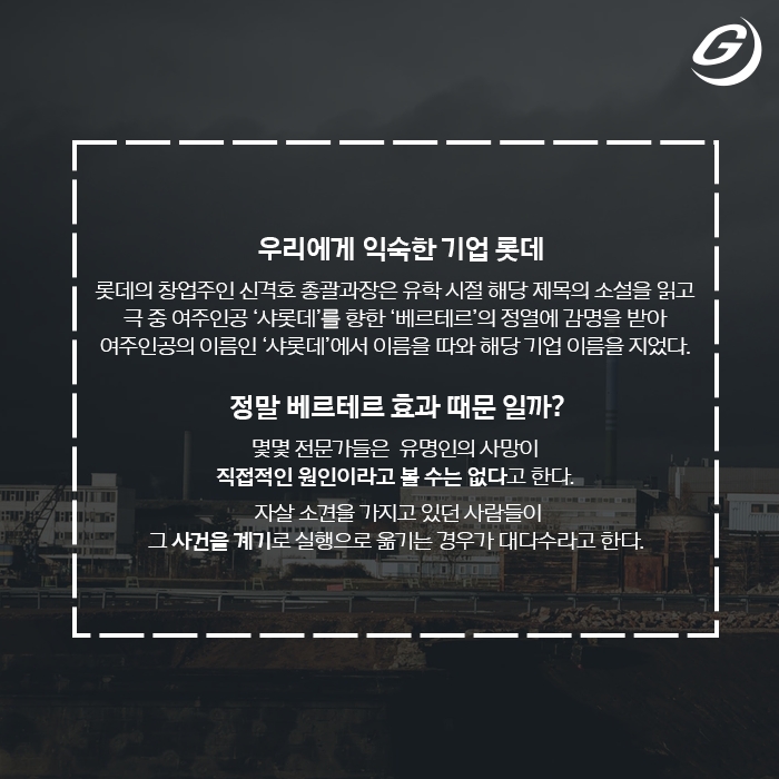 롯데의 창업주인 신격호 총괄과장은 유학 시절 해당 제목의 소설을 읽고 극 중 여주인공 ‘샤롯데’를 향한 ‘베르테르’의 정열에 감명을 받아 여주인공의 이름인 ‘샤롯데’에서 이름을 따와 해당 기업 이름을 지었다.
