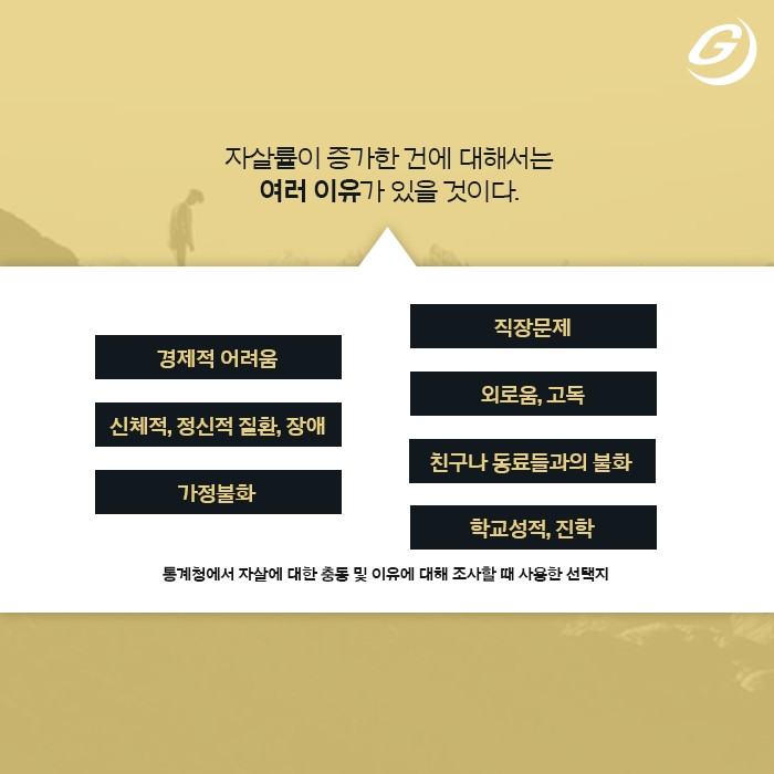 자살률이 증가한 건에 대해서는 여러 이유가 있을 것이다.