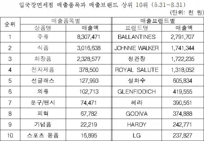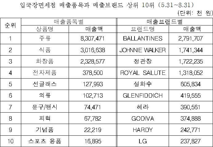 입국장 면세점과 달리 전체 면세점 판매 현황은 화장품과 향수의 판매 비중이 높았다. 올해 8월 31일까지 화장품과 향수의 면세점 매출액은 7641억 원으로 집계됐으며 상위 매출 10위 브랜드 안에 E.LAUDER, DIOR COS, SK-II 등 화장품/향수 브랜드가 다수를 차지했다.