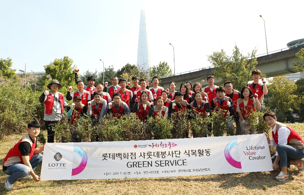이미지 확대보기롯데백화점은 9월 30일 서울 잠실 한강 생태공원에서 본사와 수도권 4개 대형 점포(본점·잠실점·노원점·영등포점)의 ‘샤롯데 봉사단’ 50여 명과 환경단체 ‘환경 실천 연합회’와 함께 미세먼지를 줄일 수 있는 숲을 조성하기 위해 나무 500여 그루를 심는 ‘샤롯데 봉사단 그린 서비스 캠페인’을 진행했다고 밝혔다.
