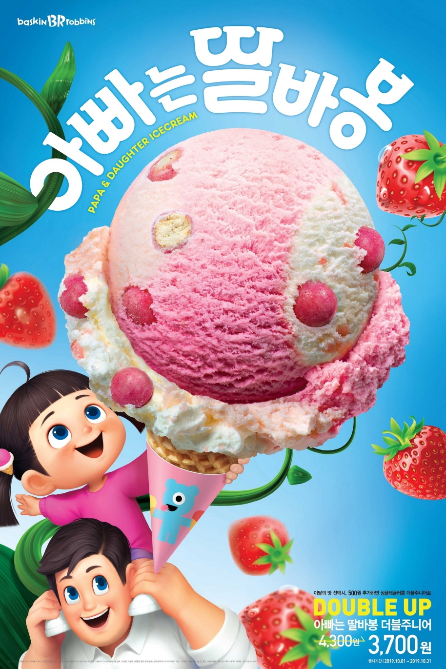 배스킨라빈스는 신제품 출시를 기념해 10월 한 달 동안 이벤트를 벌인다. 이달의 맛 ‘아빠는 딸바봉’ 구매 때 500원을 추가하면 싱글레귤러를 두 단계 업그레이드한 더블주니어로 제공한다.