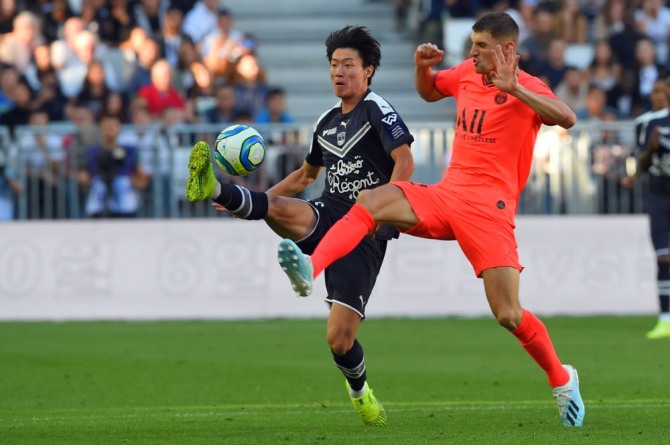 파리 생제르맹과 경기에 출전한 보르도의 황의조(왼쪽) 사진=AFP·연합뉴스