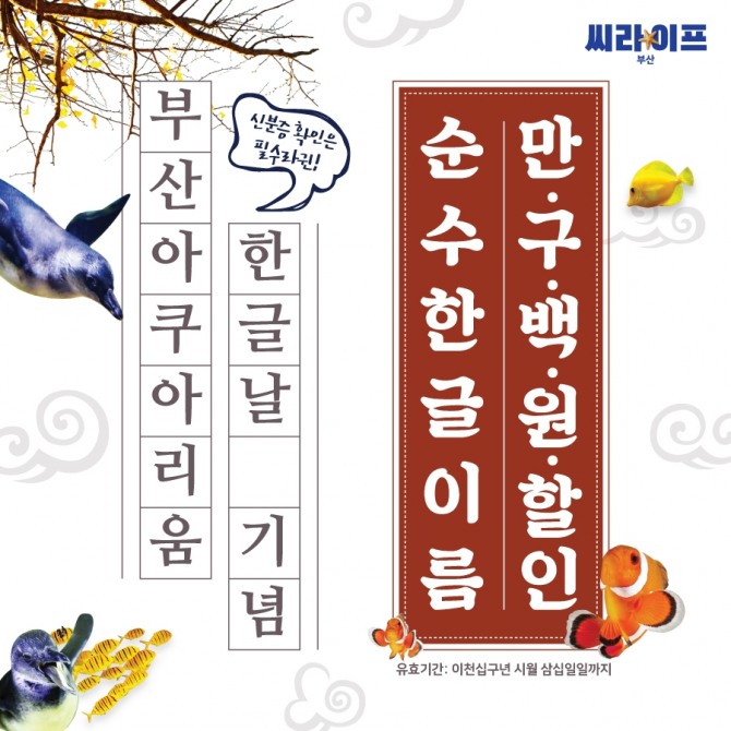 이미지 확대보기부산아쿠아리움은 오는 9일 한글날을 기념해 10월 31일까지 순수 한글 이름을 가진 방문 고객이 현장 매표소에서 신분증을 인증하는 경우, 입장권 1만900원 할인 혜택을 제공한다.