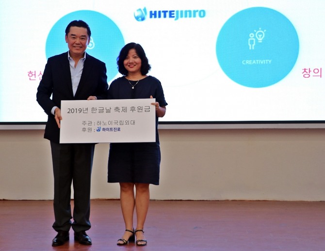 이미지 확대보기하이트진로(대표 김인규)는 지난 3일 한국대사관이 주최하고 하노이 국립 외국어 대학교(ULIS, 이하 하노이 국립 외대)가 주최, 주관하는 2019년 한글날 축제에 베트남 법인(법인장 안주현)을 통해 후원금을 전달했다고 9일 밝혔다.