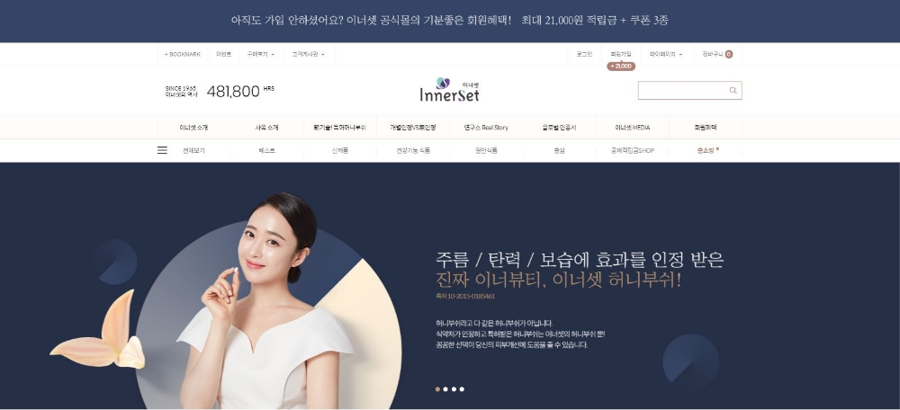 이미지 확대보기이너셋은 휴온스내츄럴의 이너뷰티 브랜다. 이 회사는 최근 이너셋의 BI를 교체하고 공식 온라인몰을 기존 '챙김몰'에서 '이너셋몰'로 개편했다.