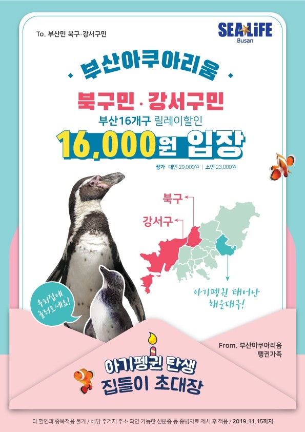 이번 아기 펭귄 탄생기념 부산시 구별 릴레이 프로모션은, 부산 강서구와 북구를 첫 시작으로 진행되며 동반 3인까지 동일하게 할인이 적용된다. 강서구와 북구민 대상 프로모션은 오는 11월 30일까지이며 거주지를 확인할 수 있는 신분증을 매표소에 제시하면 정가 2만9000원에서 할인 된 1만6000원에 입장할 수 있다.