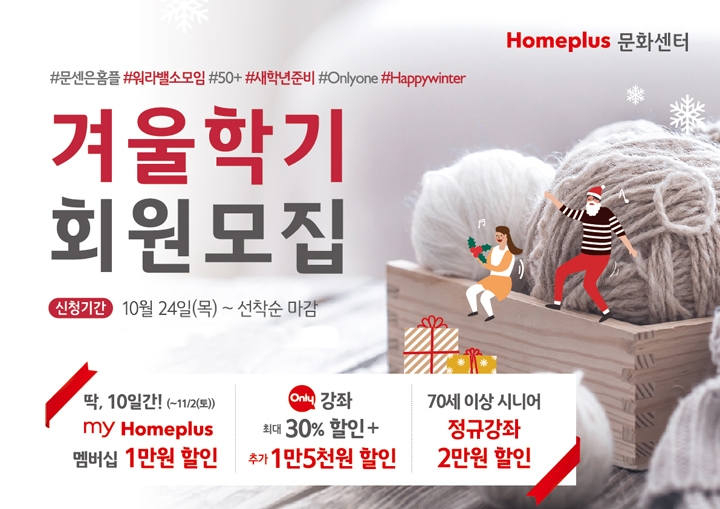 우선 다음 달 2일까지 마이홈플러스 회원이 정규강좌(강의횟수 6회 이상)를 신청하면 수강료를 1만 원 할인해준다. 또 70세 이상 액티브 시니어 수강회원에게는 강좌당 정규강좌 수강료를 2만 원 할인한다. 아울러 겨울학기 수강회원에게는 홈플러스 온라인몰과 홈플러스 더클럽에서 각각 7만 원 이상 구매 때 사용할 수 있는 5000원 할인쿠폰을 증정한다.
