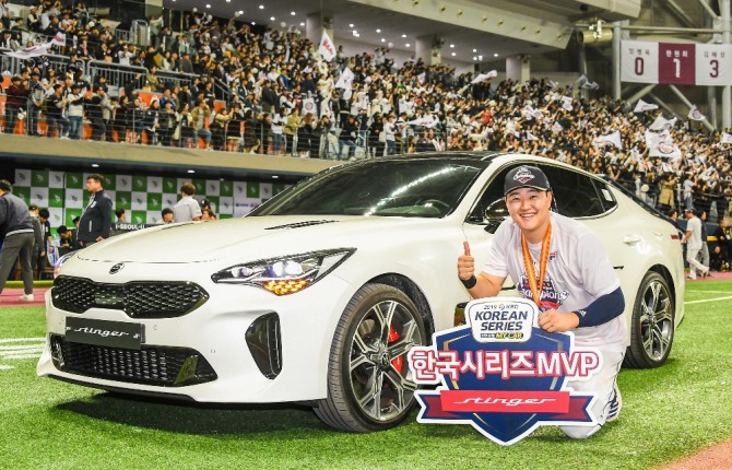 기아자동차는 26일 서울 고척스카이돔에서 열린 '2019 KBO 한국시리즈' 4차전 직후 두산 베어스 오재일 선수에게 부상으로 스팅어를 전달했다.