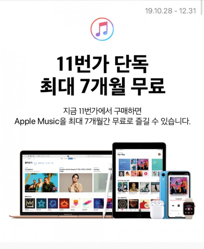 이미지 확대보기11번가가 KB국민카드와 함께 애플 뮤직 무료 이용 혜택을 제공한다고 29일 밝혔다.