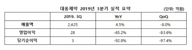 이미지 확대보기대웅제약은 1일 2019년 3분기 경영실적(별도기준)을 발표했다. 매출액은 2425억 원이었으며 영업이익과 당기순이익은 각각 28억 원, 3억 원이었다.