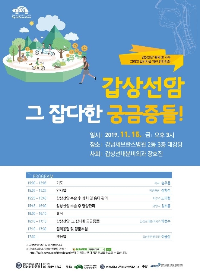 이미지 확대보기먼저 15일 오후 3층 대강당에서 갑상선암 건강강좌가 열린다. 갑상선암 수술 후 상처·흉터관리 등 갑상선암을 소개하고 환자들이 궁금해하는 내용을 중심으로 강연이 진행된다.