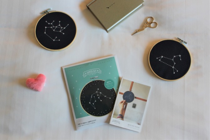 특히 핸드메이드 셀렉트숍 솜씨스토어의 DIY 키트는 '별자리 자수 가이드북' 도서 1종과 별자리 도안이 그려져 있는 원단, 별자리 자수 완성 후 그대로 수틀액자로 활용할 수 있는 수틀, 자수바늘과 자수실이 모두 포함된다. 남녀노소 누구나 쉽고 편하게 프랑스 자수를 즐길 수 있는 것.