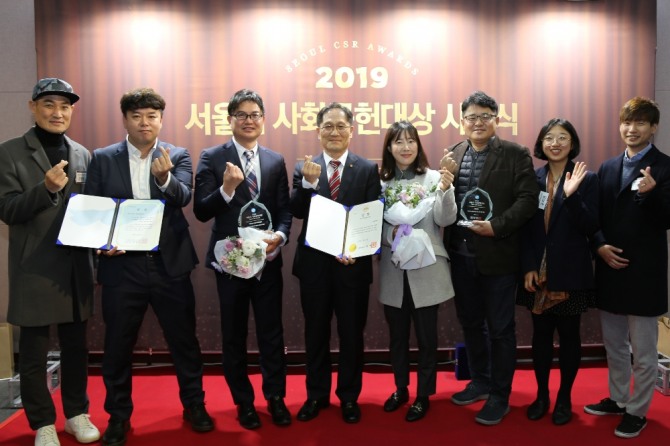 ㈜한화 사회공헌 담당자와 서울시립청소년 문화교류센터 ‘미지(MIZY)’ 직원들이 지난 15일 서울시장상을 받은 후 사진을 함께 찍고 있다.  사진=(주)한화이미지 확대보기