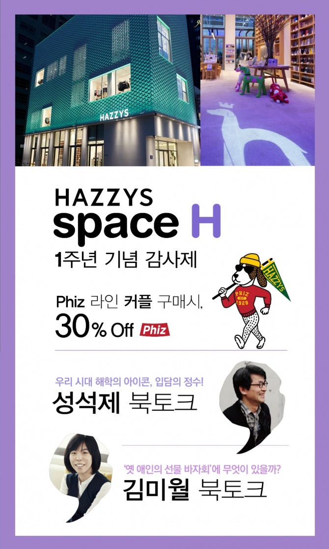 11월 18일부터 12월 31일까지 피즈(PHIZ) 라인 제품을 커플로 구매 때 30% 할인 혜택을 제공하는 프로모션도 선보인다. 피즈는 익살스러운 캐릭터, 톡톡 튀는 색감, 젊은 디자인이 특징인 스페이스H·온라인 전용 라인으로 스페이스H를 상징하는 대표 아이템이다.