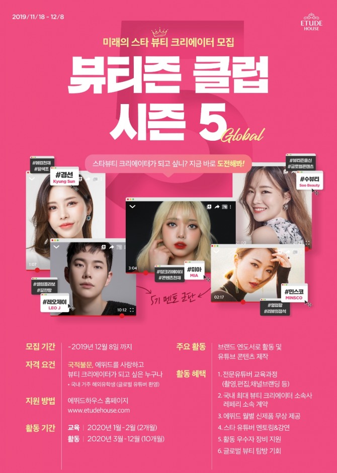 이미지 확대보기뷰티즌 클럽이란 에뛰드하우스와 함께 나만의 뷰티 영상 콘텐츠로 세상과 소통하는 스타 뷰티 크리에이터를 육성하는 프로그램이다. 선발된 참가자는 2개월간 뷰티 크리에이터 활동에 필요한 메이크업 노하우, 영상 촬영, 기획, 편집 등에 대한 체계적 교육을 받고 이후 10개월 동안 에뛰드하우스와 함께 뷰티 크리에이터 활동을 하게 된다.