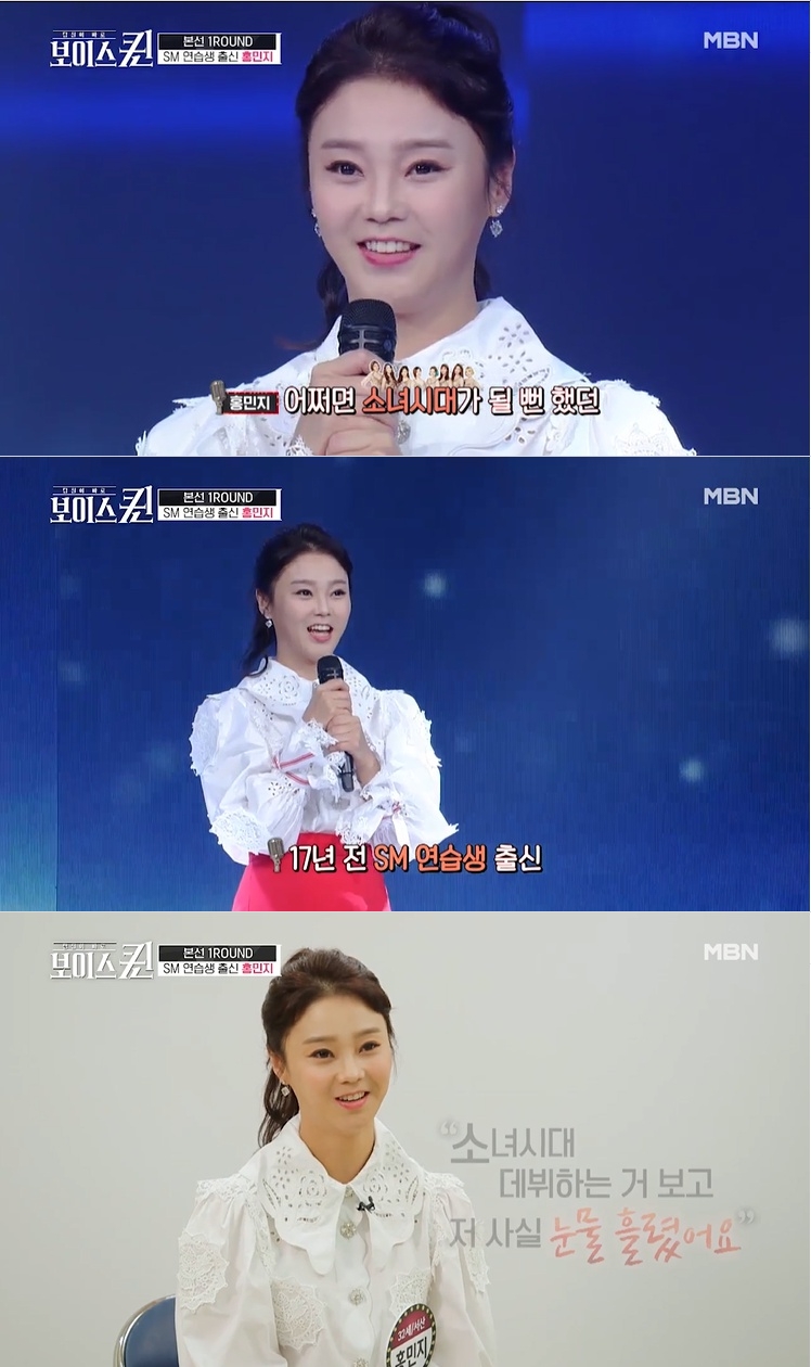 이미지 확대보기앞서 홍민지씨는 28일 방송된 MBN '보이스퀸'에서 출연, "어쩌면 소녀시대가 될 뻔 했던 17년 전 SM 연습생 출신이다"라고 자신을 소개했다. 그는 "소녀시대 데뷔하는 것을 보고 눈물을 흘렸다. '내 자리가 저긴데'라고 생각했다. 신랑이 무대에서 노래하는 것을 한 번 더 해봤으면 좋겠다고 해서 여기까지 왔다"라고 밝혀 화제를 모았다.