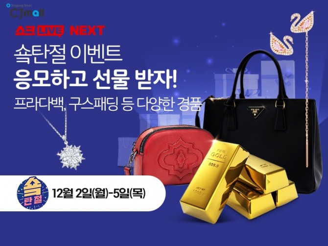 ‘숔탄절’ 이벤트 페이지에서 프로그램 별 편성 상품에 응모하면 된다. 순금 바, 풀빌라 2박 숙박권, 명품 가방, 홍천 1등급 한우 등이 준비돼 있으며, 고객 한 명 당 매일 4회 참여할 수 있다.