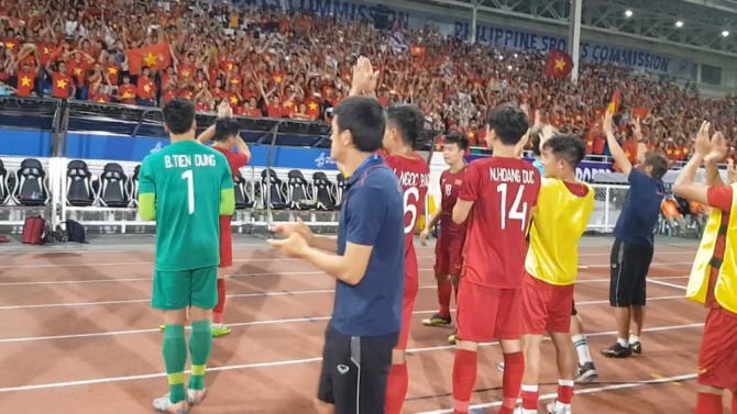 이미지 확대보기박항서 감독이 이끄는 베트남 22세 이하(U-22) 축구 대표팀이 1일 필리핀 마닐라 리살 기념 경기장에서 펼친 동남아시아게임 축구 B조 3차전에서 인도네시아에 2-1로 역전승한 뒤 베트남 축구팬들과 기뻐하고 있다. 사진=베트남축구협회 페이스북 영상 캡처 박항서호의 베트남 축구대표팀의 승리행진이 계속되고 있다.