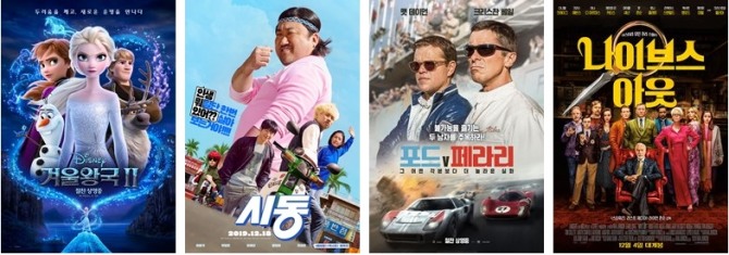 이미지 확대보기롯데시네마 주말 영화 예매율 순위에서 상위권을 차지한 '겨울왕국2', '시동', '포드 V 페라리', '나이브스 아웃'.