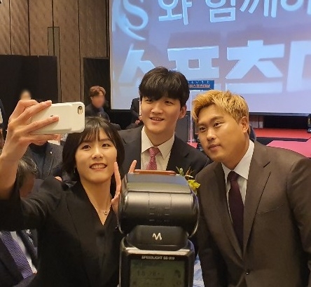 이미지 확대보기11일 서울 종로구 포시즌스호텔서울에서 열린 'CMS와 함께 하는 2019 동아스포츠대상'의 시상이 마무리 된 후, 무대 아래에서는 스타들의 '셀카 타임'이 열렸다.