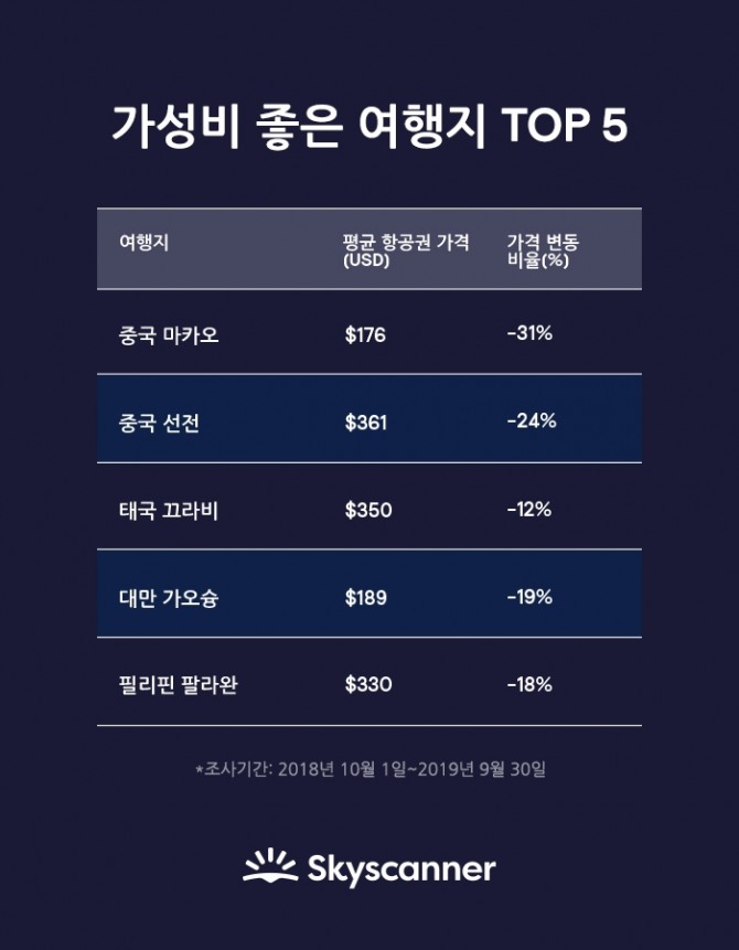 이미지 확대보기스카이스캐너는 '여행 트렌드 2020' 보고서를 발표하고 전년 대비 가격 하락율이 높고 특별한 여행 경험을 제공하는 가성비 여행지 5곳을 공개했다. 중국 마카오(-31%)가 가장 크게 하락한 항공권 가격으로 1위를 차지했고 중국 선전(-24%), 태국 끄라비(-12%), 대만 가오슝(-19%), 필리핀 팔라완(-18%)이 이름을 올렸다.