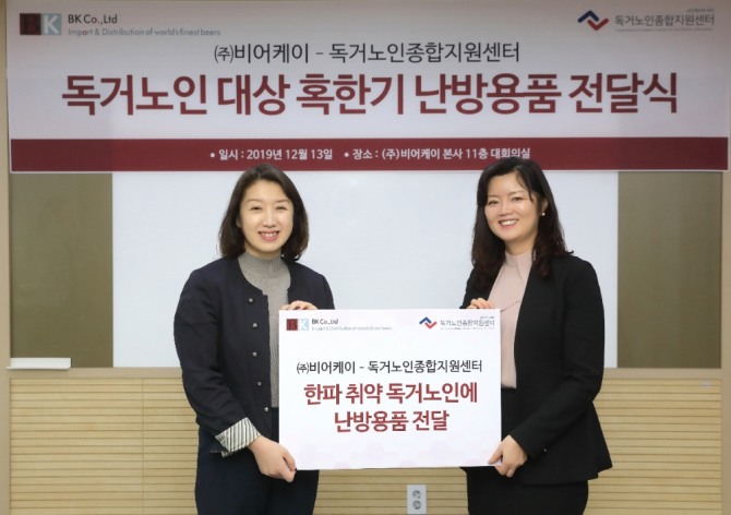 이미지 확대보기수입주류 전문유통 기업 비어케이는 13일 보건복지부 위탁 독거노인종합지원센터에 '혹한기 난방용품'을 전달했다고 밝혔다.