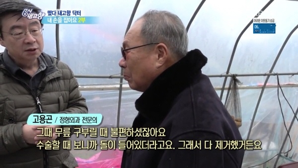 바로 아버님의 검사 결과가 나왔다. 고용곤 병원장은 “아버님은 왼쪽 무릎은 퇴행성관절염이 심한 상태여서 인공관절 수술을 받으시면 되는데, 시각장애가 있어 수술하면 더 안좋을 수 있다”며 “무릎뼈에 있는 돌을 빼내는 시술만으로도 지금보다 괜찮아 지실 것이다”라고 설명했다.