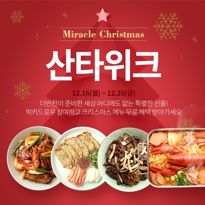 이미지 확대보기‘더반찬 산타위크’는 크리스마스 홈파티를 더욱 특별하게 즐길 수 있는 메뉴를 무료로 증정하는 행운뽑기 이벤트다.