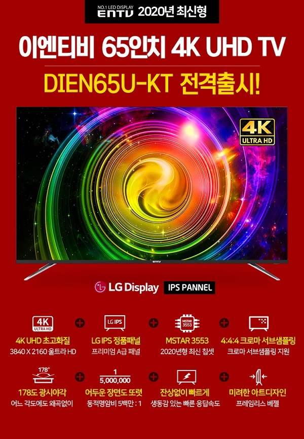 이엔티비 관계자는 “뛰어난 성능의 합리적 가격과 탄탄한 기본기를 갖춘 실속형 대형TV를 고민한다면 ENTV 2020년형 65인치 UHD TV DIEN65U-KT 모델을 눈여겨 보길 바란다”라고 말했다”