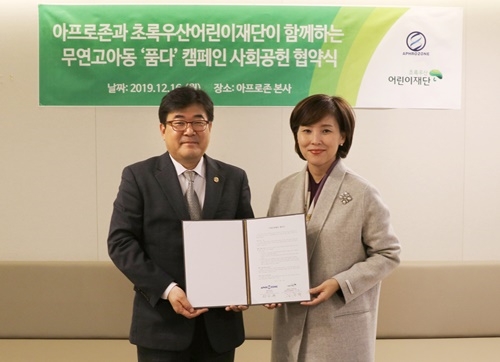 이미지 확대보기아프로존은 지난 16일 서울 강남구 자사 본사에서 초록우산어린이재단과 무연고 아동 지원을 위한 ‘품다’ 캠페인 2020년도 사회공헌 협약을 체결했다고 18일 밝혔다.