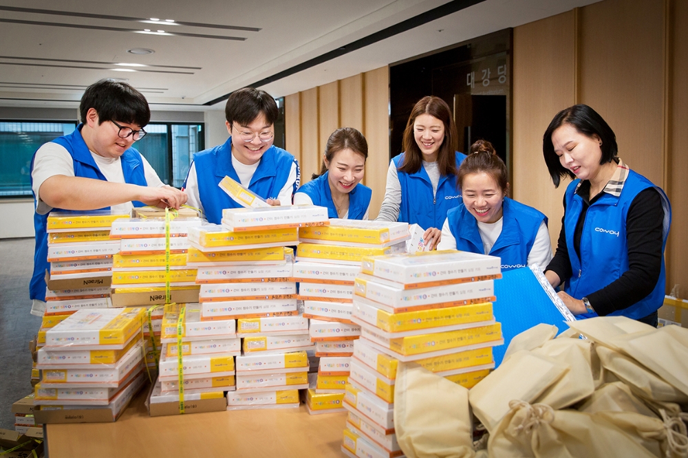 이미지 확대보기라이프케어기업 웅진코웨이의 비즈니스 전문가 ‘블루버드’는 지난 17일 서울아산병원에서 한국소아암재단과 함께 소아암 완치 어린이들을 위한 치료종결 축하 행사를 진행하며 봉사활동을 펼쳤다. 웅진코웨이 블루버드들이 완치 어린이들을 위한 기념 선물을 포장하고 있다. 사진=웅진코웨이