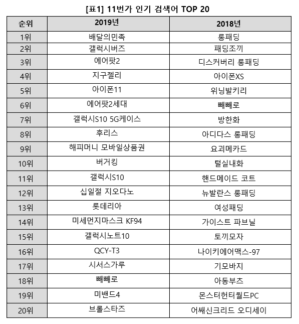"패딩의 몰락?"…11번가에서 올해 최고의 검색어는 ‘배달의민족’, ‘갤럭시버즈’, ‘에어팟2’