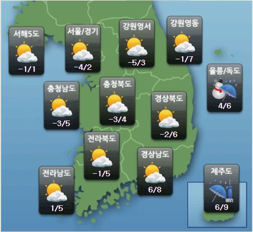 지역별 아침 기온은 서울·경기 영하 4도(-4도), 강원영서 -5도, 강원영동 -1도, 충남 -3도, 충북 -3도, 전남 1도, 전북 -1도, 경남 6도, 경북 -2도, 제주 6도, 백령 -1도, 울릉·독도 4도다.