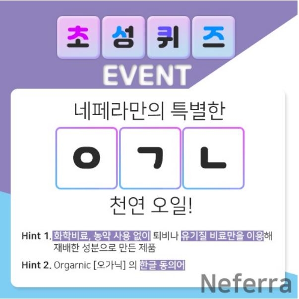이미지 확대보기이날 출제된 네일케어 네페라 셀프네일 관련 초성 퀴즈는 ‘네페라만의 특별한 ㅇㄱㄴ 천연 오일’의 문장 속 초성 부분을 맞추는 문제다.