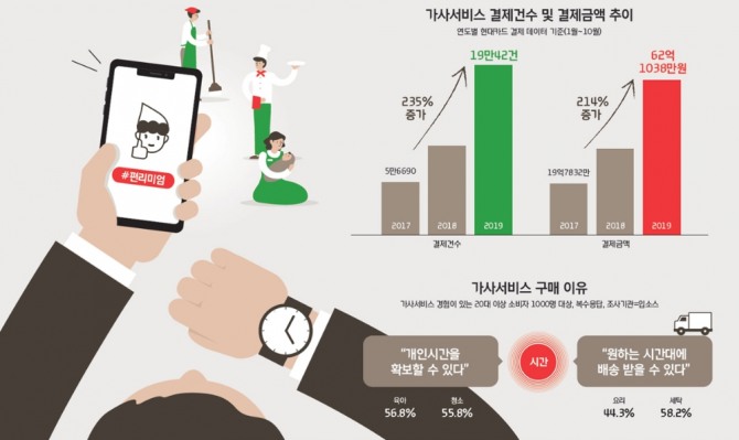 1인 가구나 맞벌이 가구를 위한 가사 노동 서비스, 심부름, 줄서기 등이 대표적이며 관련 제품이나 서비스가 어플리케이션과 SNS를 통해 급속도로 진화하고 있다. 특히 고급스러운 요리를 직접 체험할 수 있는 밀 키트와 출퇴근 시간 등 장소의 제약을 받지 않고 독서 가능한 오디오 북 시장은 그 규모가 매년 크게 성장하고 있다.