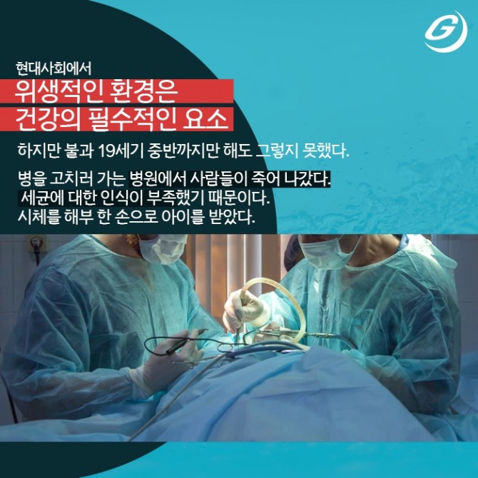 병을 고치러 가는 병원에서 사람들이 죽어 나갔다. 세균에 대한 인식이 부족했기 때문이다. 시체를 해부 한 손으로 아이를 받았다.