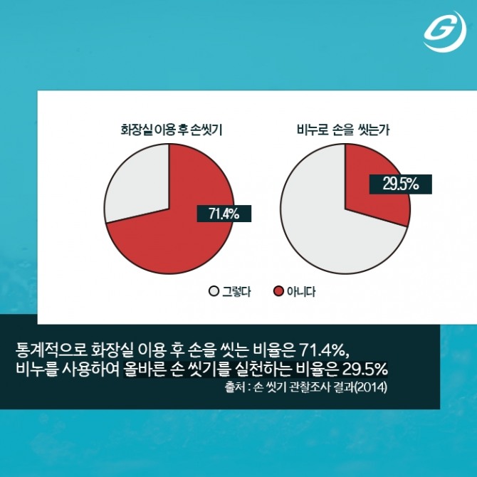 통계적으로 화장실 이용 후 손을 씻는 비율은 71.4%, 비누를 사용하여 올바른 손 씻기를 실천하는 비율은 29.5% (자료 출처 : 손 씻기 관찰조사 결과)