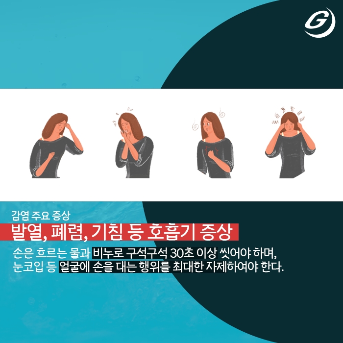 손은 흐르는 물과 비누로 구석구석 30초 이상 씻어야 하며, 눈코입 등 얼굴에 손을 대는 행위를 최대한 자제하여야 한다.