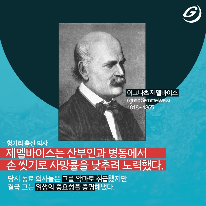 헝가리 출신 의사 제멜바이스는 산부인과 병동에서 손 씻기로 사망률을 낮추려 노력했다.