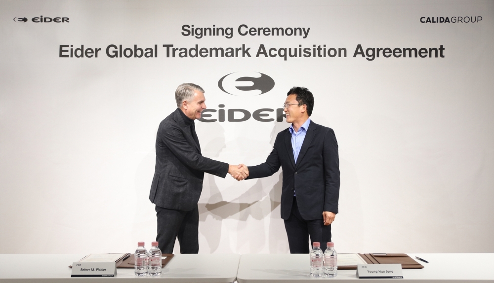 이미지 확대보기아이더에 따르면 지난 3일 강남구 자곡동 K2코리아그룹 본사 사옥에서 아이더 글로벌 상표권 인수 협약식을 진행됐다. 정영훈 K2코리아그룹 대표, 라이너 피슐러 칼리다 그룹 CEO 등이 참석했다.