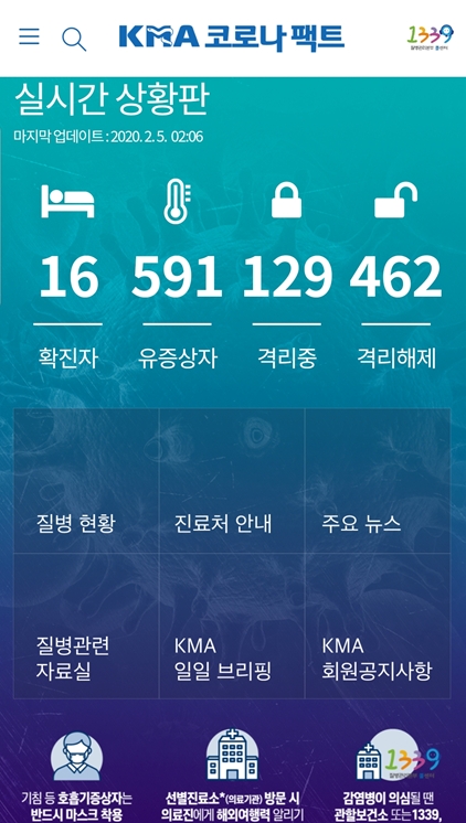 이미지 확대보기의사협회는 최근 확산 중인 우한 폐렴과 관련한 정확한 정보를 전달하기 위해 이 앱을 개발했다. 앱은 실시간 상황판, 질병 현황, 진료처 안내, 주요 뉴스, 질병관련 자료실, KMA 일일브리핑, KMA 회원 공지사항 등으로 구성됐다.