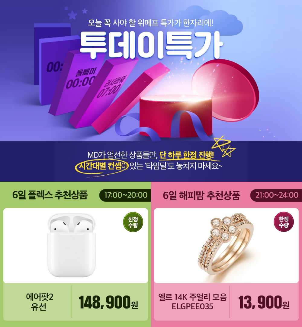 이미지 확대보기위메프의 투데이특가는 매일 자정부터 24시간 동안 인기 상품을 초특가에 판매하는 기획전이다. 이번 개편으로 투데이특가에 하루 6번 진행되는 타임딜을 테마별로 추가했다.