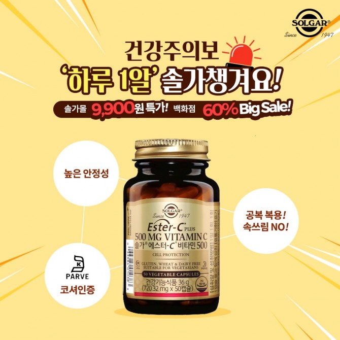 프로모션은 솔가몰과 백화점 입점 매장∙종합몰 등에서 만날 수 있다. 솔가몰에서는 오는 11일까지 '솔가 에스터-C 500'을 72% 할인된 9900원에 구입할 수 있다. 백화점 입점 매장에서는 이달 한 달간 솔가 에스터-C 500을 60% 할인하고 종합몰에서는 1+1 이벤트를 벌인다.