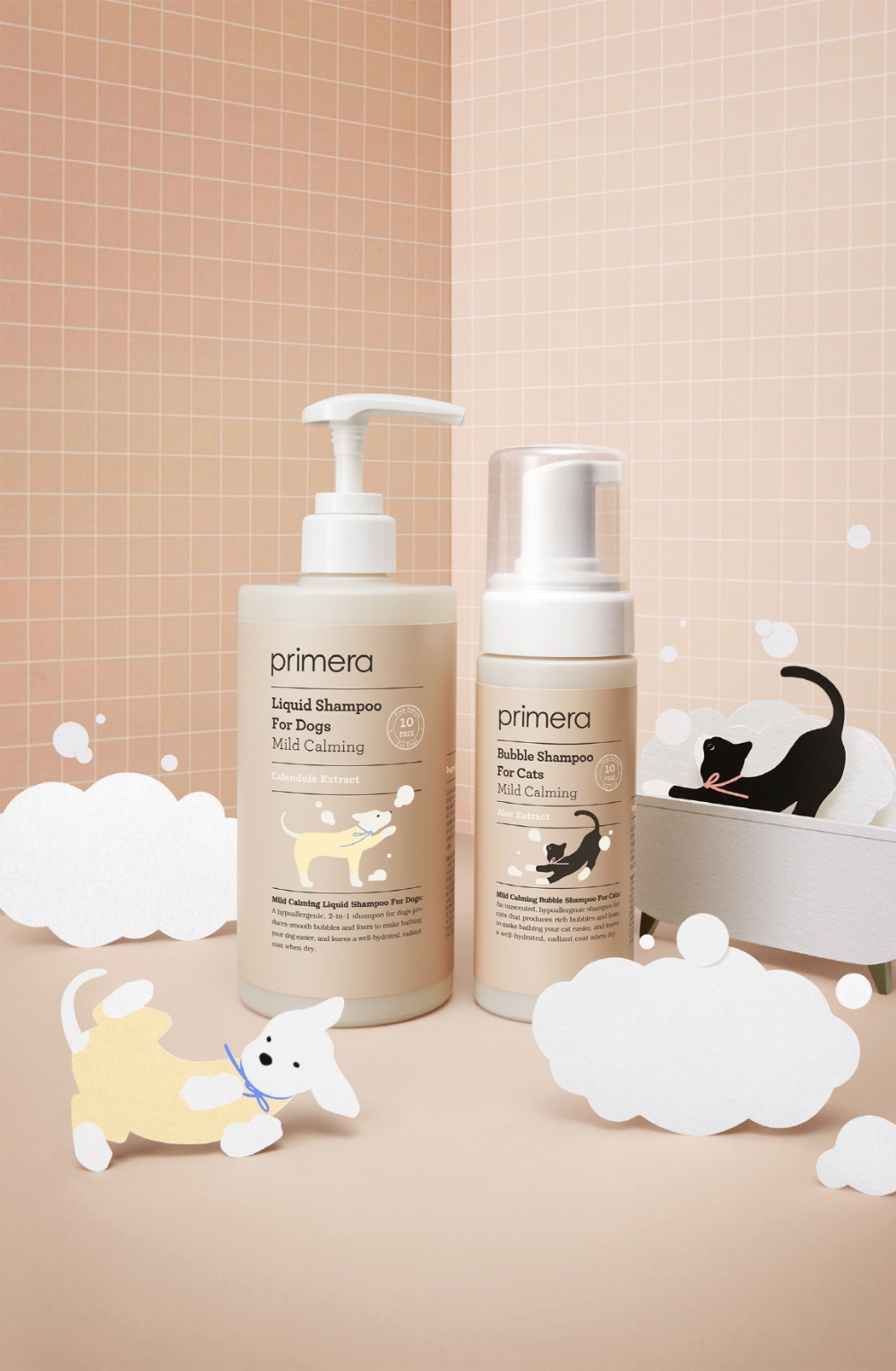 '마일드 카밍 버블 샴푸 포 캣'도 자연 유래 계면활성제 성분을 사용했다. 풍성한 거품 샴푸로 한 손으로 잡고 사용 가능해 편리하고 신속하게 목욕을 마무리할 수 있다. 향에 민감한 고양이를 위해 무향 처리했다. 노령견도 함께 사용할 수 있다.