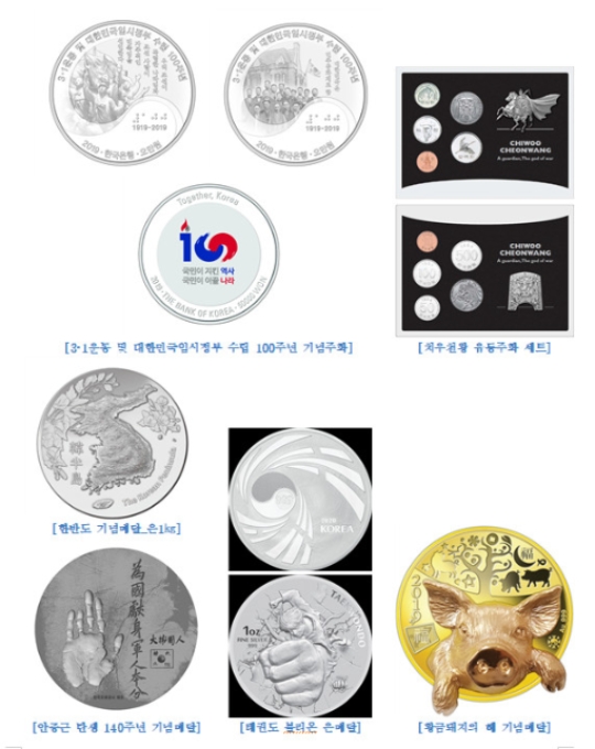 주요 기념주화와 메달은 출시 이후 큰 인기를 끌었던 3·1운동, 대한민국임시정부수립 100주년 기념주화 세트를 비롯해 한류스타 엑소(EXO) 공식 기념메달(9종), 치우천왕·태권도 불리온 메달 등이다.
