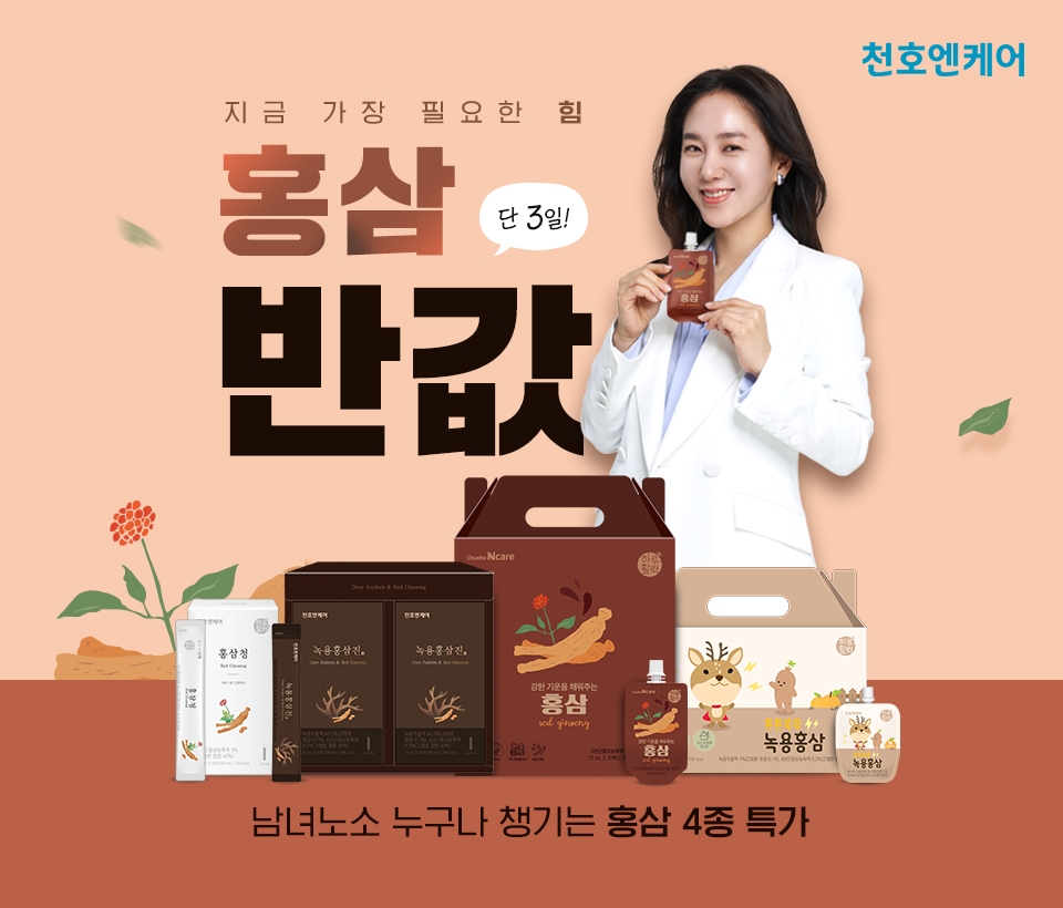 이에 천호엔케어는 대표 홍삼 제품 4종을 반값에 판매하는 프로모션을 준비했다. 2030세대를 위한 건강식품 브랜드 하루활력의 건강즙 '강한 기운을 채워주는 홍삼'과 간편하게 섭취할 수 있는 스틱형 제품 '홍삼청' 어린이들을 위한 키즈 음료 '튼튼쑥쑥 녹용홍삼'과 홍삼과 녹용을 배합한 프리미엄 건강음료 '녹용홍삼진' 등을 만나볼 수 있다.