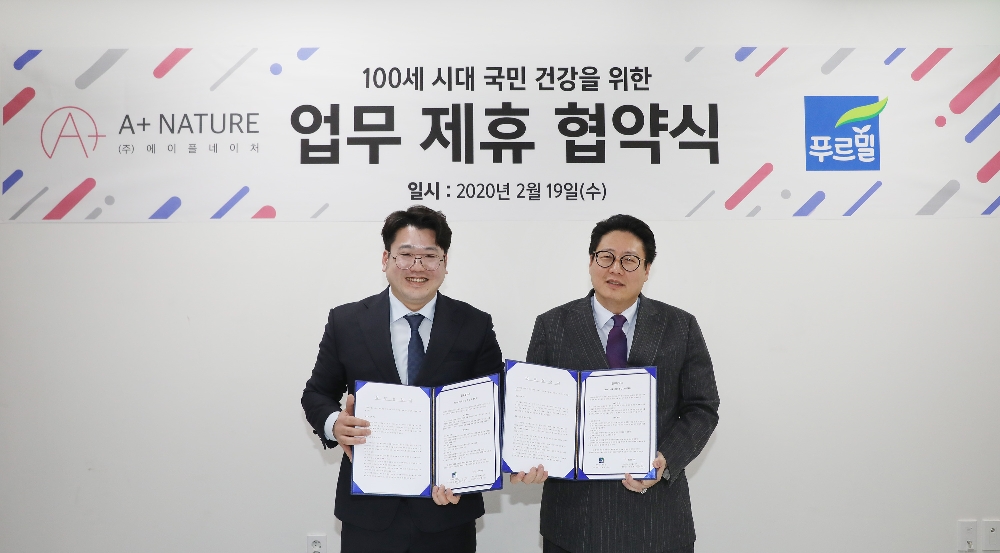 푸르밀과 에이플네이처는 19일 서울 역삼동 에이플네이처 본사에서 ‘100세 시대 국민 건강을 위한 업무협약’을 체결했다고 밝혔다. 이날 협약식에는 푸르밀 신동환 대표이사와 에이플네이처 이성훈 대표이사 등이 참석했다.