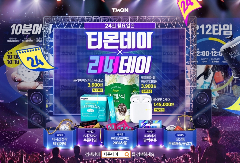 이날 동시 진행되는 '티몬데이×리퍼데이'에서는 다양한 특가 상품과 인기 리퍼상품도 한 자리에서 만나볼 수 있다. 0시부터는 1시간 간격으로 24회 타임어택이 진행돼 최대 86%까지 할인된 가격의 인기 상품을 판매한다. 주요 상품은 '에어팟 2세대' '더마 핸드 클리너' 등이다. 티몬블랙딜로는 '마이쉐프 밀키트' '닥터 핸드크린 손세정제' 등이다.